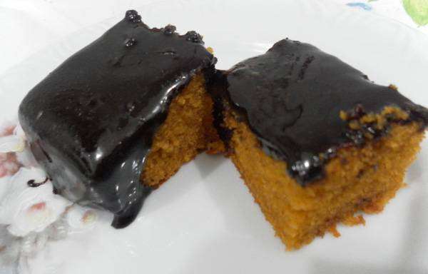 - E em seguida despeje essa mistura com chocolate por cima da que esta na forma, fazendo com que essa mistura fique por cima no centro da massa de cenoura e ao redor do furo da forma.