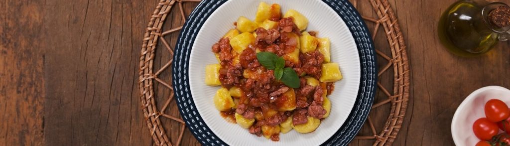 Quando penso em receitas que me transportam para momentos especiais da infância, o Nhoque de mandioquinha com ragu de linguiça sempre vem à mente. É…
