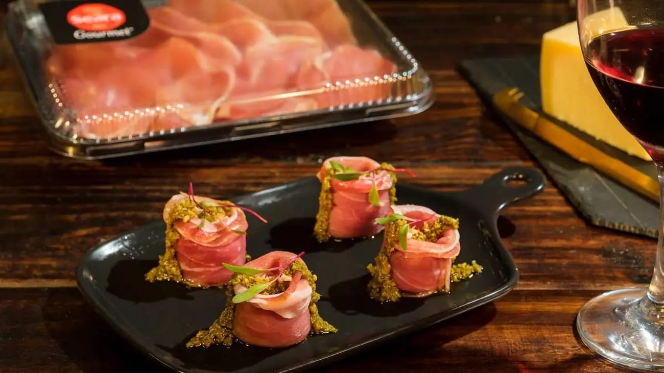 - Aperitivo de Mussarela, Pesto, Nozes e Presunto de Parma: O Presunto Parma fatiado Seara Gourmet é enrolado em bolinhas de mozarella de búfala, servido com molho pesto, nozes e brotos de beterraba.