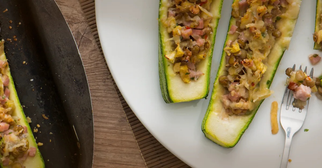 - Em uma frigideira, refogue a cebola na margarina e acrescente o miolo da abobrinha, a lentilha, a pimenta, o presunto e deixe refogar. Desligue fogo e adicione a salsinha e as nozes;