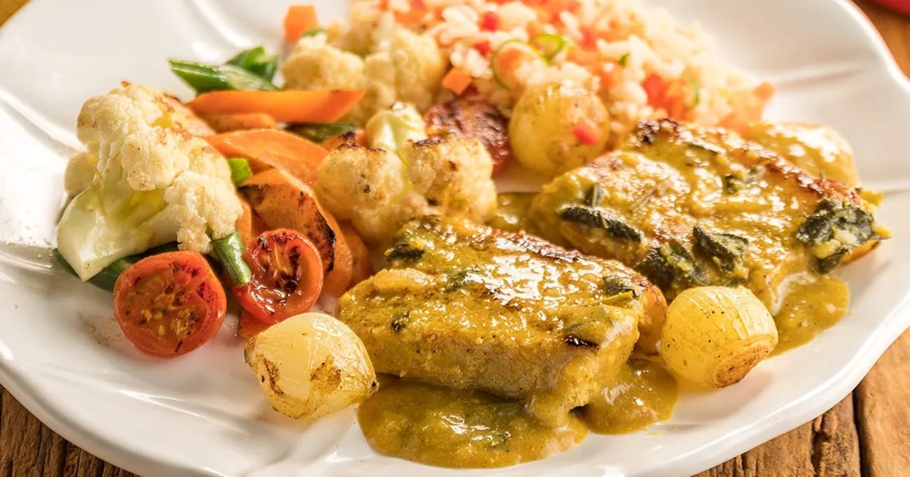 - Em outra frigideira, prepare os Legumes Salteados: Aqueça o azeite, adicione o alho e salteie em fogo alto a couve-flor e a cenoura por 4 minutos. Acrescente a vagem e, após 3 minutos, adicione os tomatinhos. Salteie por mais 1 minuto, temperando com sal e pimenta do reino. Reserve.