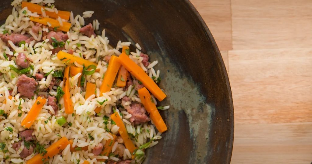 - Neste momento, junte as cenouras, as raspas de limão, a linguiça e tempere com sal e pimenta. Finalize com cheiro-verde e sirva. A adição das cenouras e do limão traz uma nota de frescor e cor ao prato, enquanto o cheiro-verde adiciona um toque aromático.