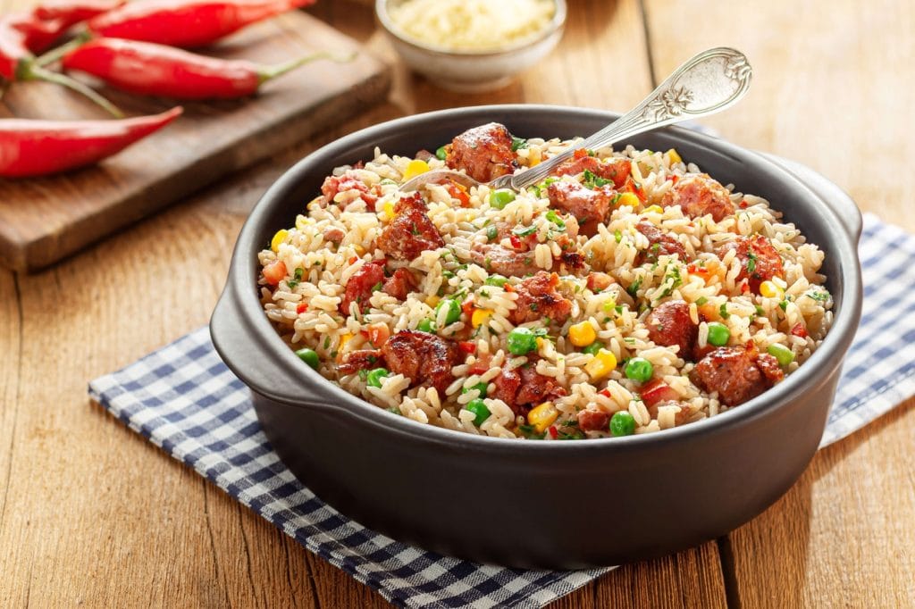 - Agora, é hora de adicionar o arroz à panela, mexendo bem para que os grãos fiquem bem coatados com a banha e misturados com a linguiça e os legumes. Tempere com sal a gosto.
