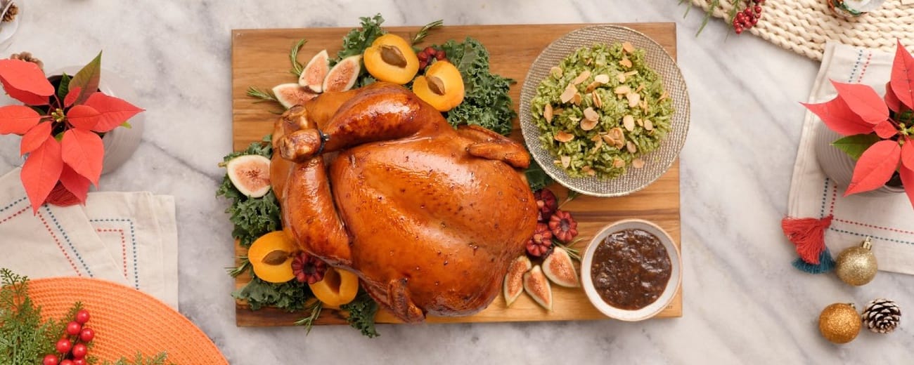 - Quando o peru estiver pronto, retire-o do forno e deixe descansar por 10 minutos antes de fatiar. Sirva com o molho de ameixa por cima e decore com salsa e coentro fresco.