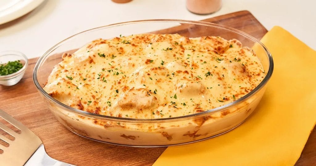 - Em um refratário adicione as batatas, o frango, o molho branco e cubra com queijo mussarela em fatias.