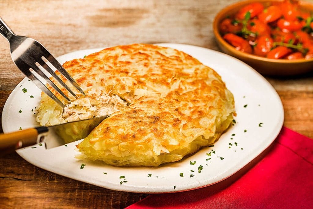- Pegue outra frigideira untada e vire a batata sua. Cozinhe por mais 3 minutos deste lado.