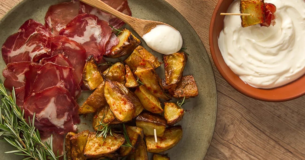 - Monte uma tábua ou travessa rasa com as batatas e as fatias de copa.