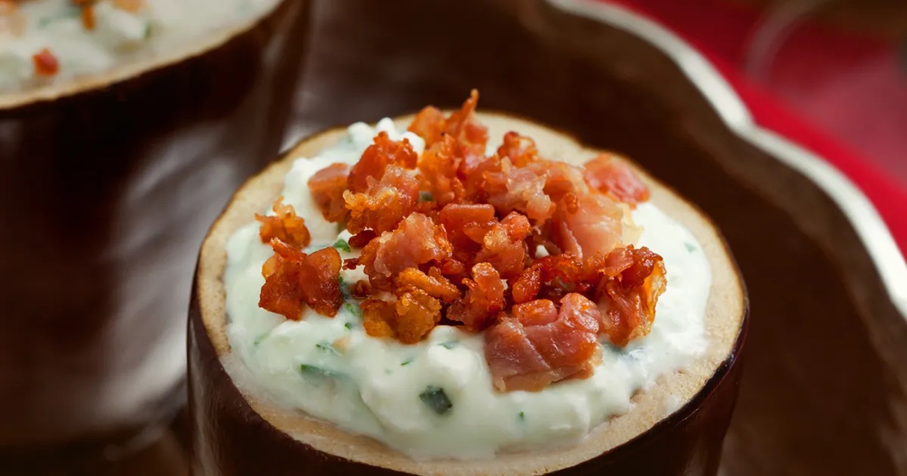 - Misture o queijo cottage com as ervas frescas picadas. Em seguida, recheie as berinjelas com essa mistura. Finalize salpicando os presuntos crocantes por cima. Sirva e aproveite!