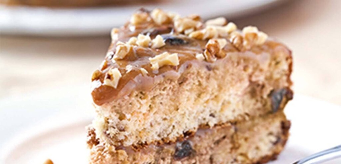 - Retire o bolo do forno, espere esfriar e desenforme sobre um prato grande. Corte ao meio, no sentido horizontal, e umedeça as 2 partes do bolo com o MID restante já dissolvido na calda da ameixa. Distribua metade do recheio em uma delas e cubra com a outra parte do bolo. Espalhe o restante do recheio/cobertura pela superfície e pela lateral do bolo. Decore com as nozes restantes e leve à geladeira até o momento de servir.