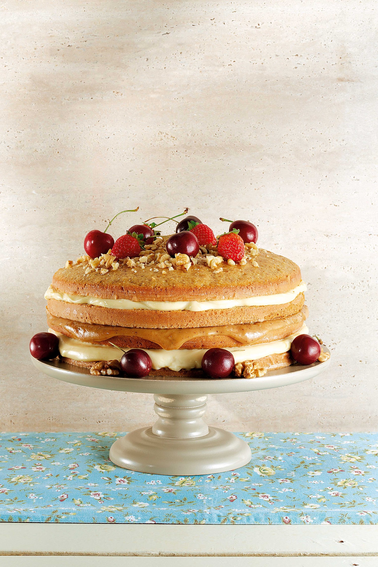 - Decore com frutas vermelhas e nozes picadas no topo do bolo.