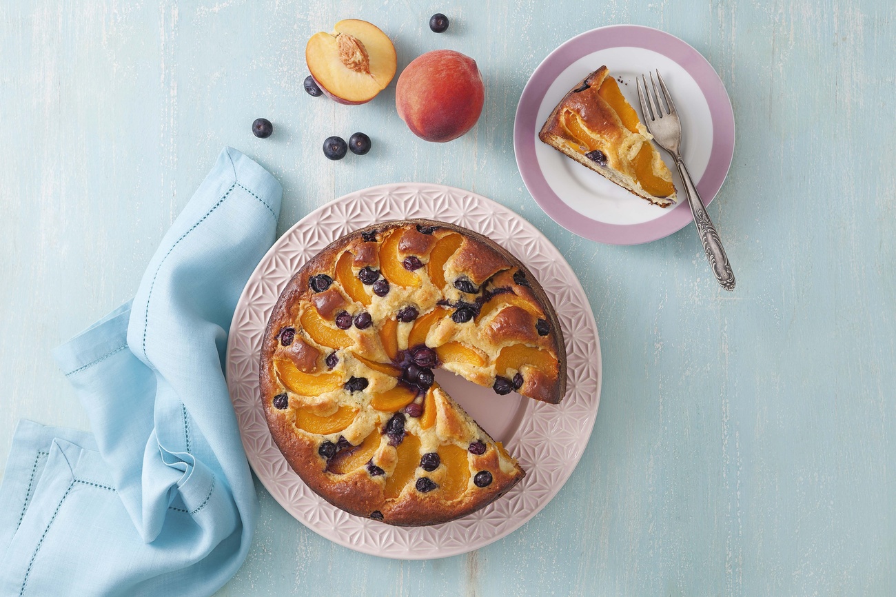 - Despeje a massa em uma forma de aro removível, com 22 cm de diâmetro, previamente untada com manteiga e polvilhada com farinha de trigo. Acomode as fatias de pêssego e os mirtilos sobre a massa, distribuindo-os de forma harmoniosa. Leve ao forno médio, preaquecido a 180°C, por cerca de 40 minutos, ou até que um palito inserido no centro do bolo saia limpo. Este tempo pode variar dependendo do seu forno, então é importante ficar de olho no bolo nos últimos minutos de cozimento.