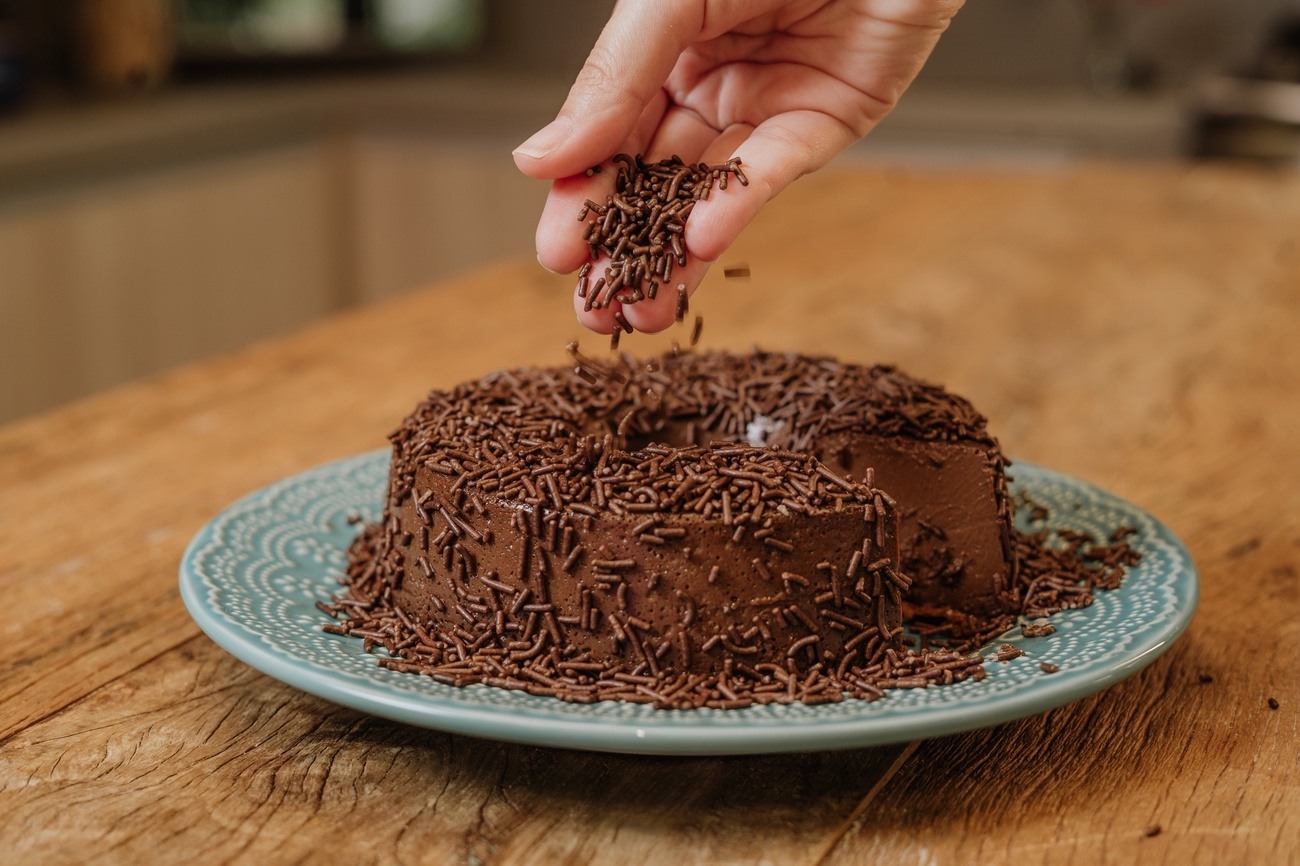 - Desenforme ainda morno e decore toda a superfície com o granulado. Leve à geladeira por cerca de 6 horas antes de servir. A paciência vale a pena para ver o brigadeirão ficar ainda mais irresistível.