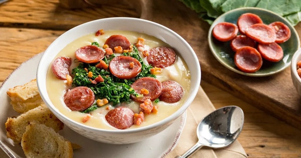 Quando penso em Caldo Verde, vem à mente a imagem de uma mesa repleta de gente, comendo em silêncio, enquanto o aroma do prato invade o ambiente. É um momento de conexão com a família e a tradição. E é justamente por isso que quero compartilhar com vocês essa receita de Caldo Verde com Farofinha Crocante de Bacon. É um prato simples, mas que carrega uma riqueza de sabores e emoções. Com a combinação de salsão, cebola, alho-poró e ervas, o caldo verde é um verdadeiro refúgio para os sentidos. E a farofinha de bacon, que é feita com pão torrado e bacon, é a perfeita complementação para esse prato. É um momento de felicidade e satisfação que vocês podem experimentar em casa.