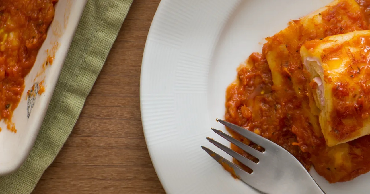 - Disponha os canelones em um refratário próprio para forno e cubra com o molho de tomate.