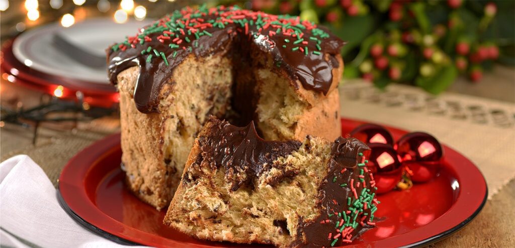 - Recheie o chocotone com parte do creme preparado, deixando espaço suficiente para a tampa. Coloque a tampa reservada para fechar a cavidade e despeje o creme restante por cima. Decore com confeitos verdes e vermelhos e sirva em seguida.