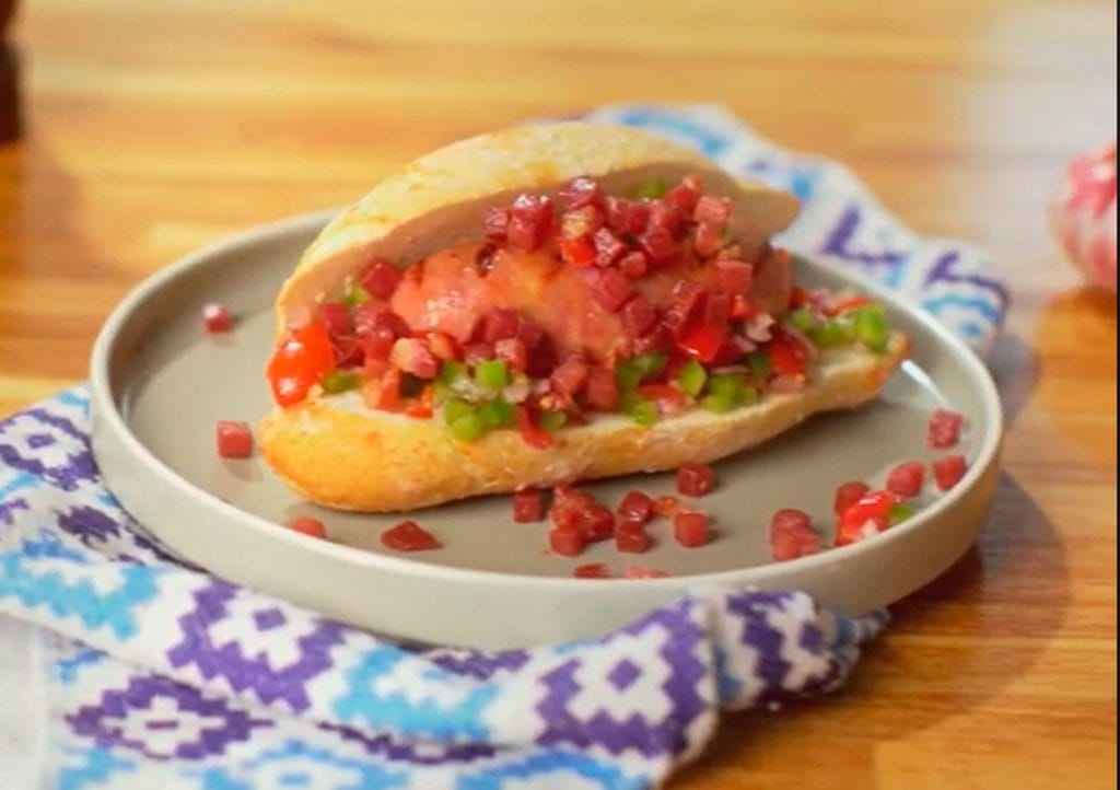 - Para servir, monte o choripan com mostarda, linguia, cubos de Copa Frimesa e vinagrete.