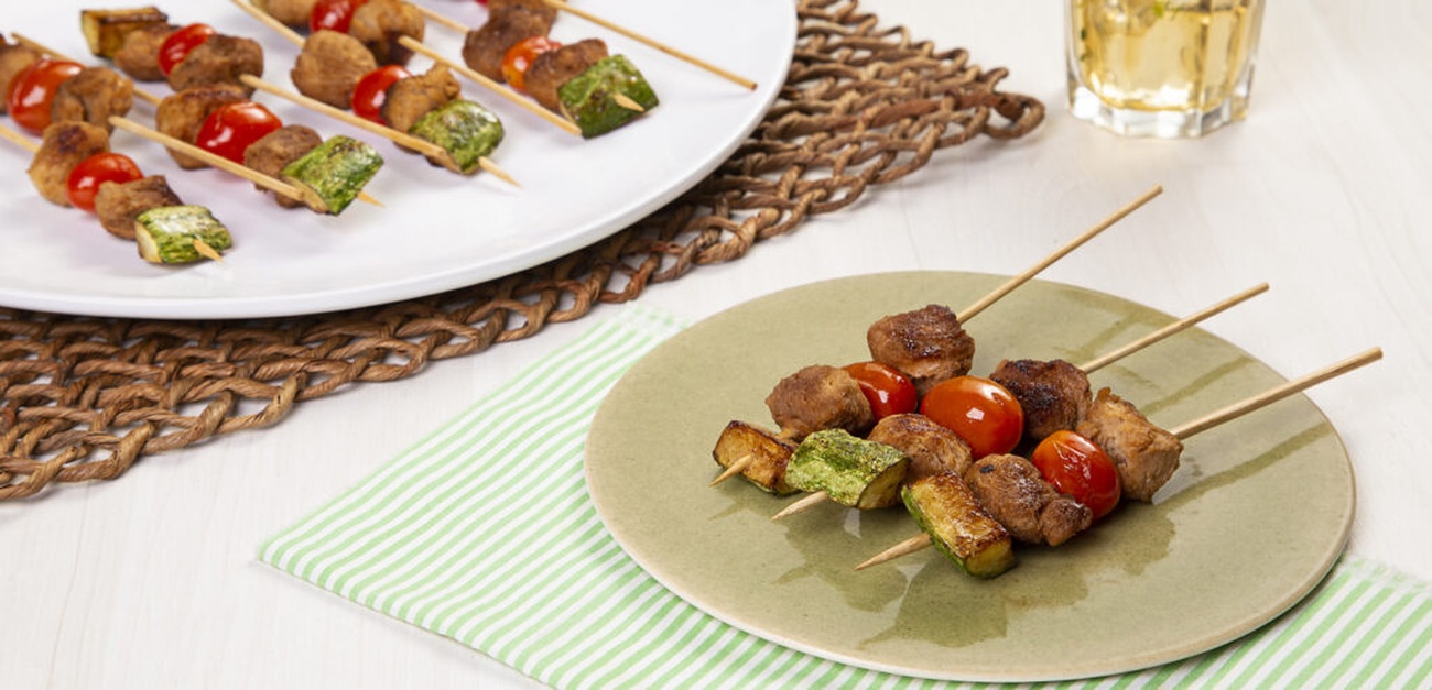 - Monte 18 espetinhos em palitos para churrasco finos, intercalando pedaços da proteína de soja, tomate, proteína de soja e abobrinha. Tente distribuir os ingredientes de forma uniforme para que cada espetinho tenha uma boa combinação de sabores e texturas.