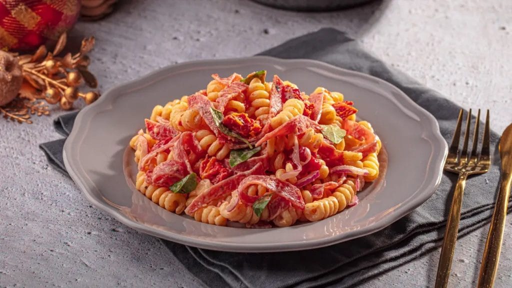 Salada de Macarrão com Salame, Tomate Seco e Manjericão