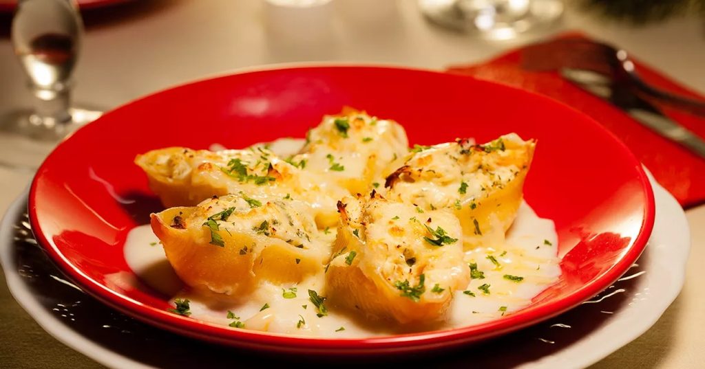 - Em um refratário, coloque uma camada do molho, distribua os conchigliones recheados por cima e cubra com o restante do molho.