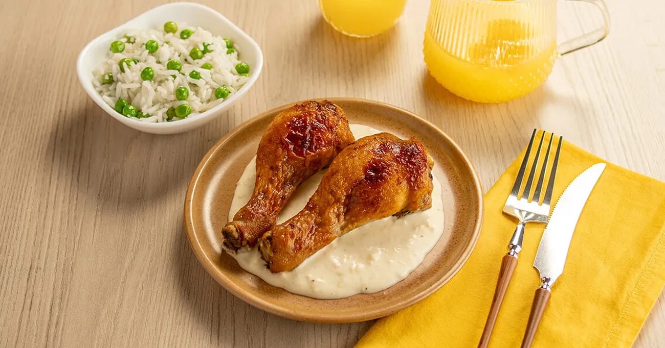 - Assim que as Coxas de Frango Temperada Frango Fácil estiverem prontas, retire do forno e sirva o arroz com ervilha e o molho de queijo. O momento de servir é especial, pois é quando você pode ver a alegria nos olhos de quem vai desfrutar desse prato delicioso.