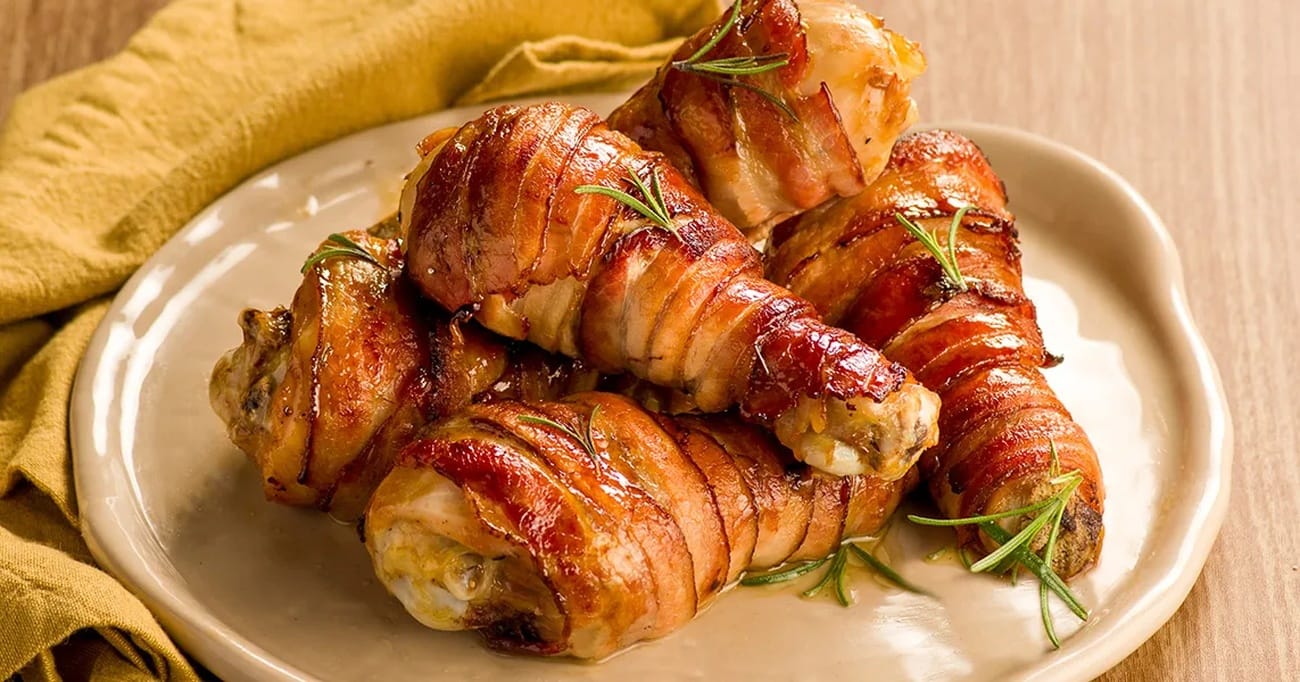 - Agora, é hora de montar o prato. Enrole as fatias de bacon em cada coxa de frango, certificando-se de cobrir bem toda a superfície.