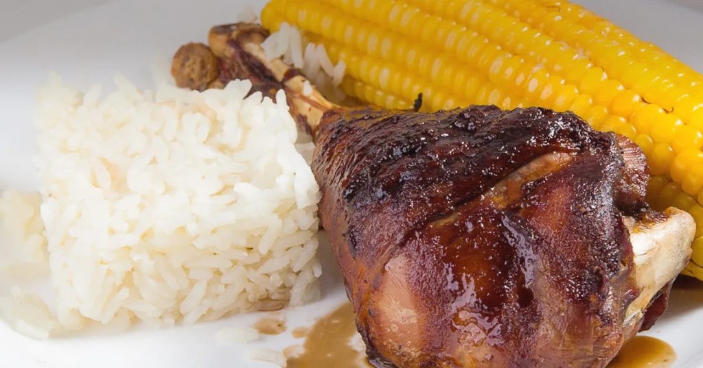 - Sirva as coxas de peru regadas com a redução de cerveja, acompanhadas pelo arroz cozido e a espiga de milho, com um toque de manteiga derretida por cima. Este prato é uma combinação perfeita de sabores e texturas, certamente para agradar a todos.