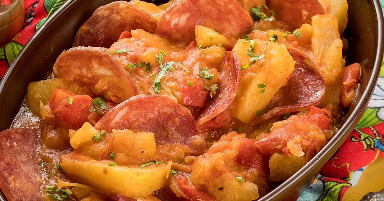 - Desligue o fogo e finalize com a salsinha ou coentro picados e o salame fatiado. Isso irá adicionar um toque fresco e um pouco de textura ao nosso cozido.