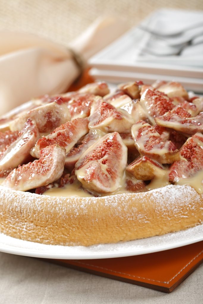 - Regue a massa com o suco de laranja, coloque o creme de Leite MOÇA por cima e distribua os figos de forma harmoniosa. Essa é a etapa final, onde você pode ser criativo com a apresentação.