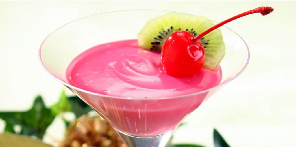 - Distribua a mistura em copinhos descartáveis transparentes. Para decorar, corte uma fatia de kiwi em forma de triângulo e coloque uma cereja em cima de cada copinho. Sirva gelado e aproveite a delícia!