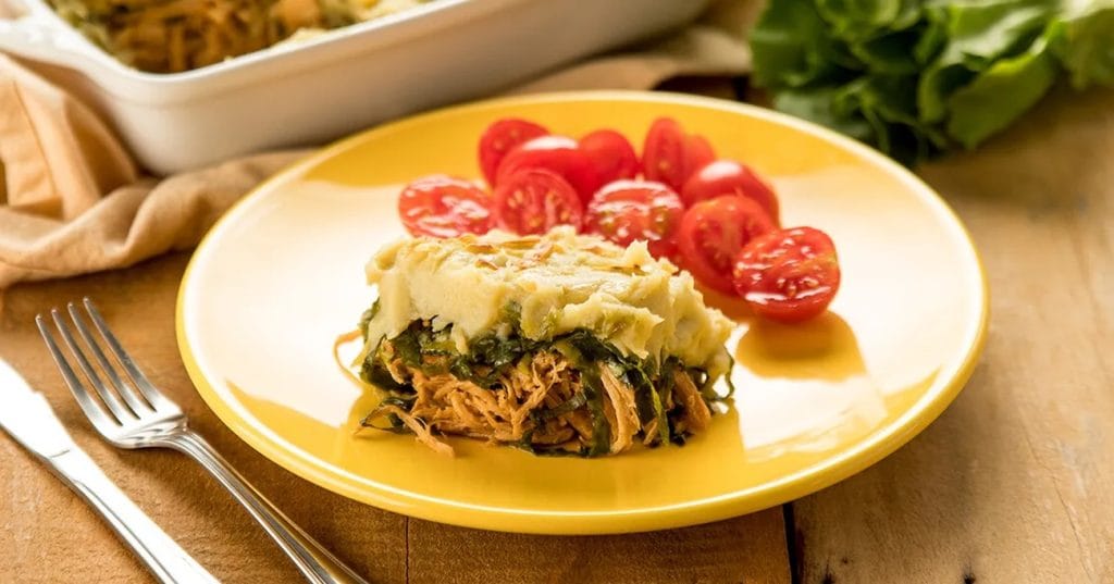 - Para a montagem, coloque o frango desfiado em um refratário que possa ir ao forno, forrando todo o fundo. Em seguida, faça uma camada com as folhas de escarola em tiras; por fim, cubra com o purê de batata-doce e salpique o queijo parmesão ralado.