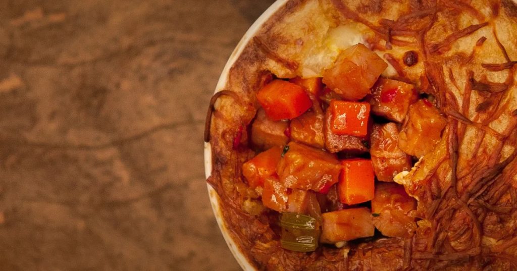 - Em um refratário próprio para forno faça camadas colocando: metade do purê, todo o recheio, 1 camada de requeijão e a outra metade do purê para cobrir.