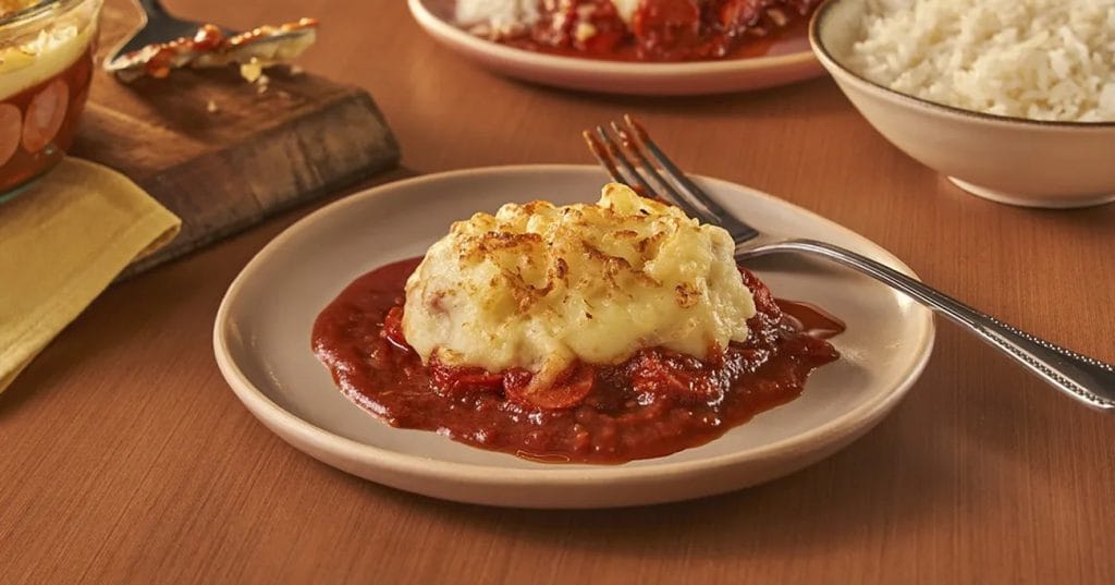 - Para a montagem, utilize um refratário. Coloque uma camada de salsicha em rodelas com molho de tomate e cubra com o purê de batatas. Finalize com o queijo muçarela ralado por cima. Leve ao forno pré-aquecido a 200 °C até que o queijo esteja dourado e borbulhante. Essa etapa é mágica, pois é quando todos os sabores se unem de forma perfeita.