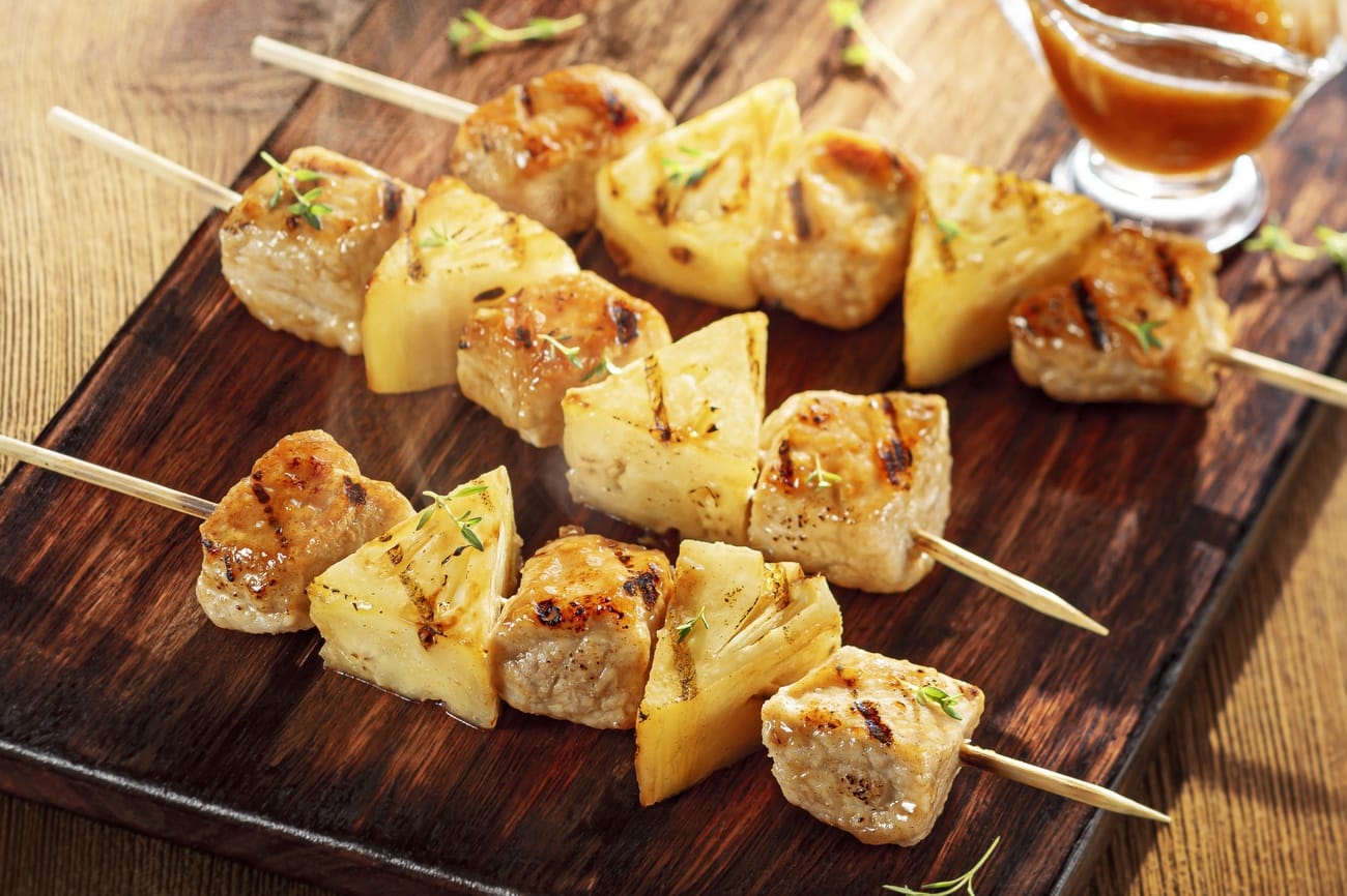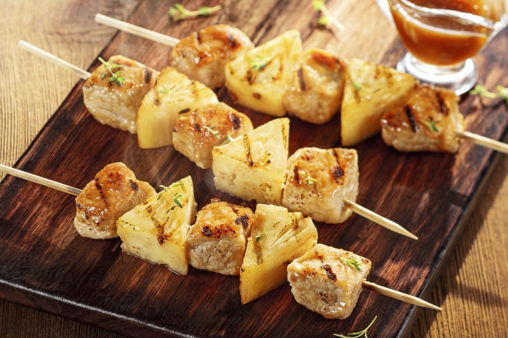 - Espete nos palitos de churrasco cubos de carne e pedaos de abacaxi, intercalando-os.