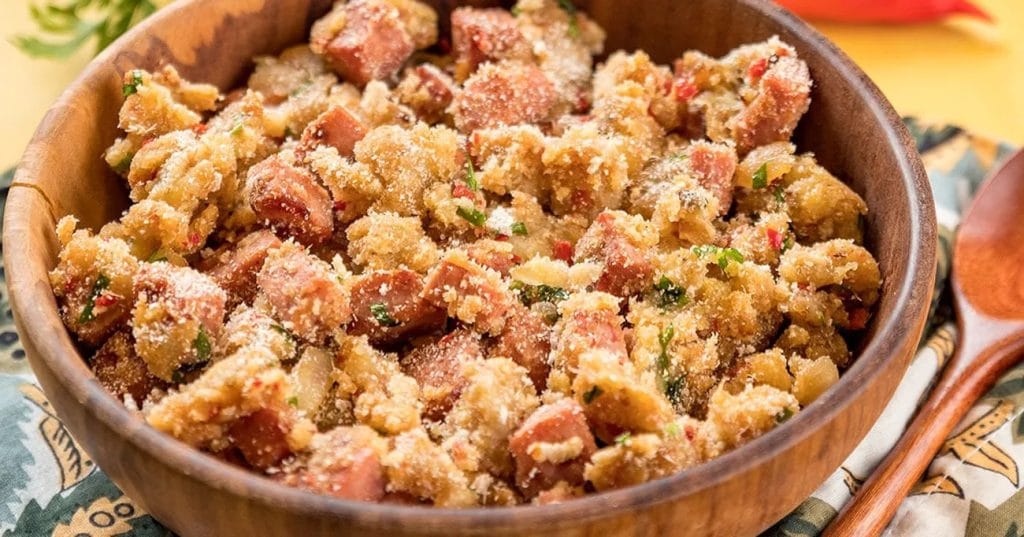 Quando penso em farofa, lembro-me das tardes de domingo em que a minha avó preparava o almoço para a família. A casa estava cheia de cheiros deliciosos: o aroma da farinha de mandioca fervendo no caldeirão, o suave cheiro da banana madura e o sabor intenso do presunto de peru. Era um momento de pureza e amor, quando a família se reunia à mesa para compartilhar um prato simples, mas cheio de carinho. E é justamente essa sensação que eu quero compartilhar com vocês hoje, com a receita da Farofa de Banana com Cubinhos de Presunto de Peru, um prato clássico que combina a doçura da banana com a salgadice do presunto. Além disso, é uma receita fácil e rápida de preparar, perfeita para um almoço ou jantar especial.