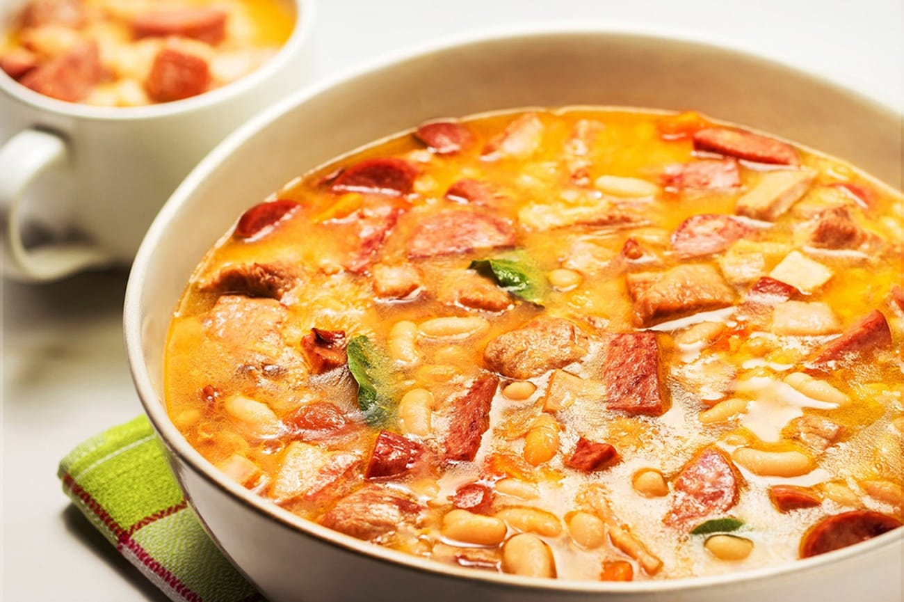 - Acrescente o feijão branco, a folha de louro e o caldo de legumes. Deixe levantar fervura.