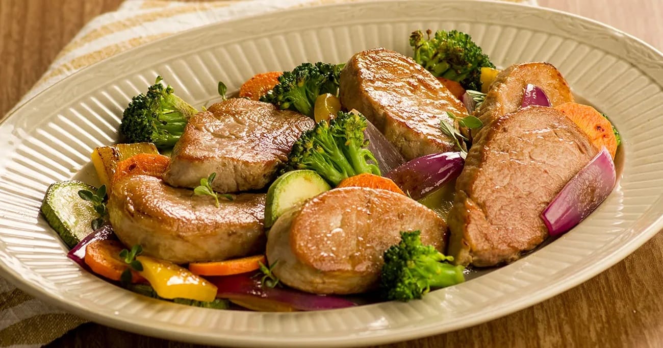 - Sirva as fatias de filé mignon suíno grelhado acompanhadas dos legumes refogados.