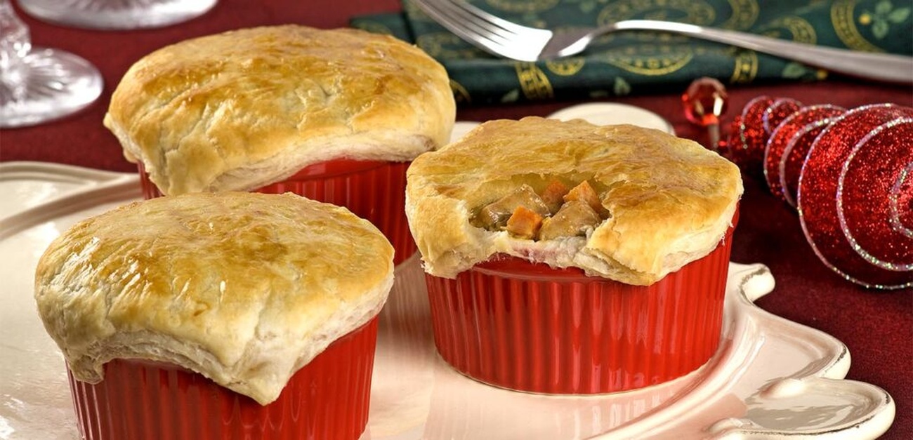 - Distribua a mistura em 6 refratários pequenos, próprios para suflê, com cerca de 10 cm de diâmetro. Cubra cada um com uma placa de massa folhada e pincele a superfície com 1 clara batida.