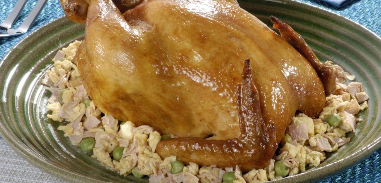 - Com o recheio pronto, retire o frango da geladeira e recheie-o com a mistura preparada. Feche o frango com o auxílio de palitos de dente ou barbante, certificando-se de que o recheio fique bem distribuído e o frango, bem fechado.