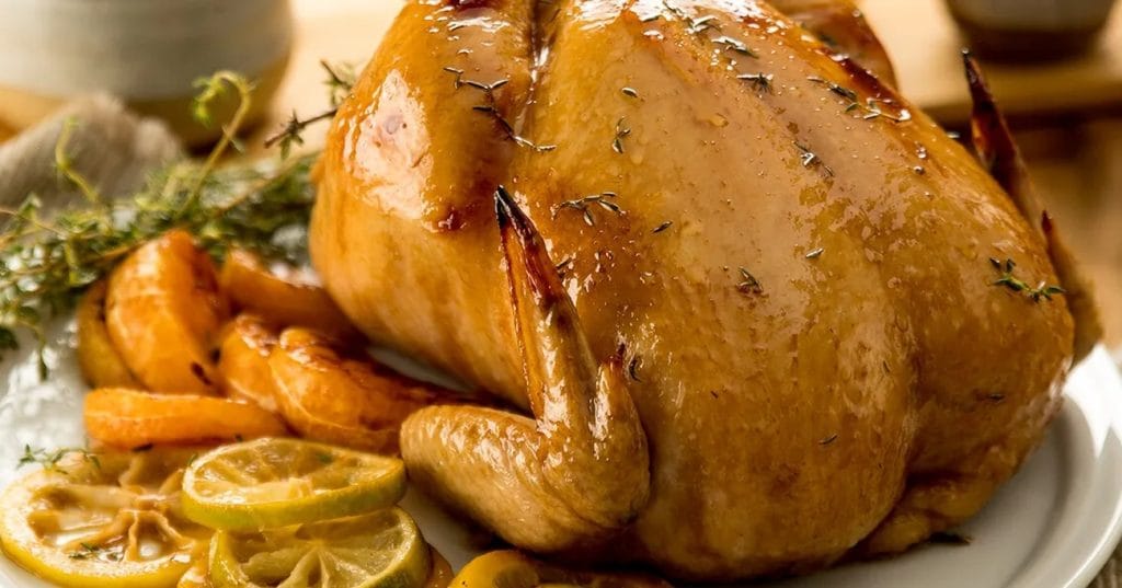 - Na hora de servir, posicione o frango recheado no centro de um prato. Coloque as rodelas de limão e os gomos de tangerina ao redor do frango, criando uma apresentação atraente e convidativa. Regue tudo com o molho da assadeira, que é rico em sabores e aromas, e está pronto para ser servido.