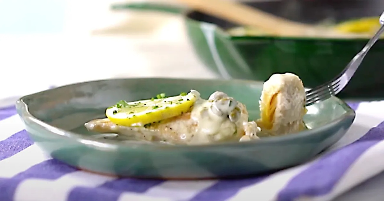 - Reduzir o fogo para médio, juntar o suco de limão e o caldo de frango. Deixar ferver por 5 minutos e juntar o creme de leite e as alcaparras.