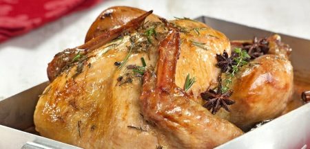 - Retire do forno, remova o barbante e fatie o frango. Reserve aquecido.
