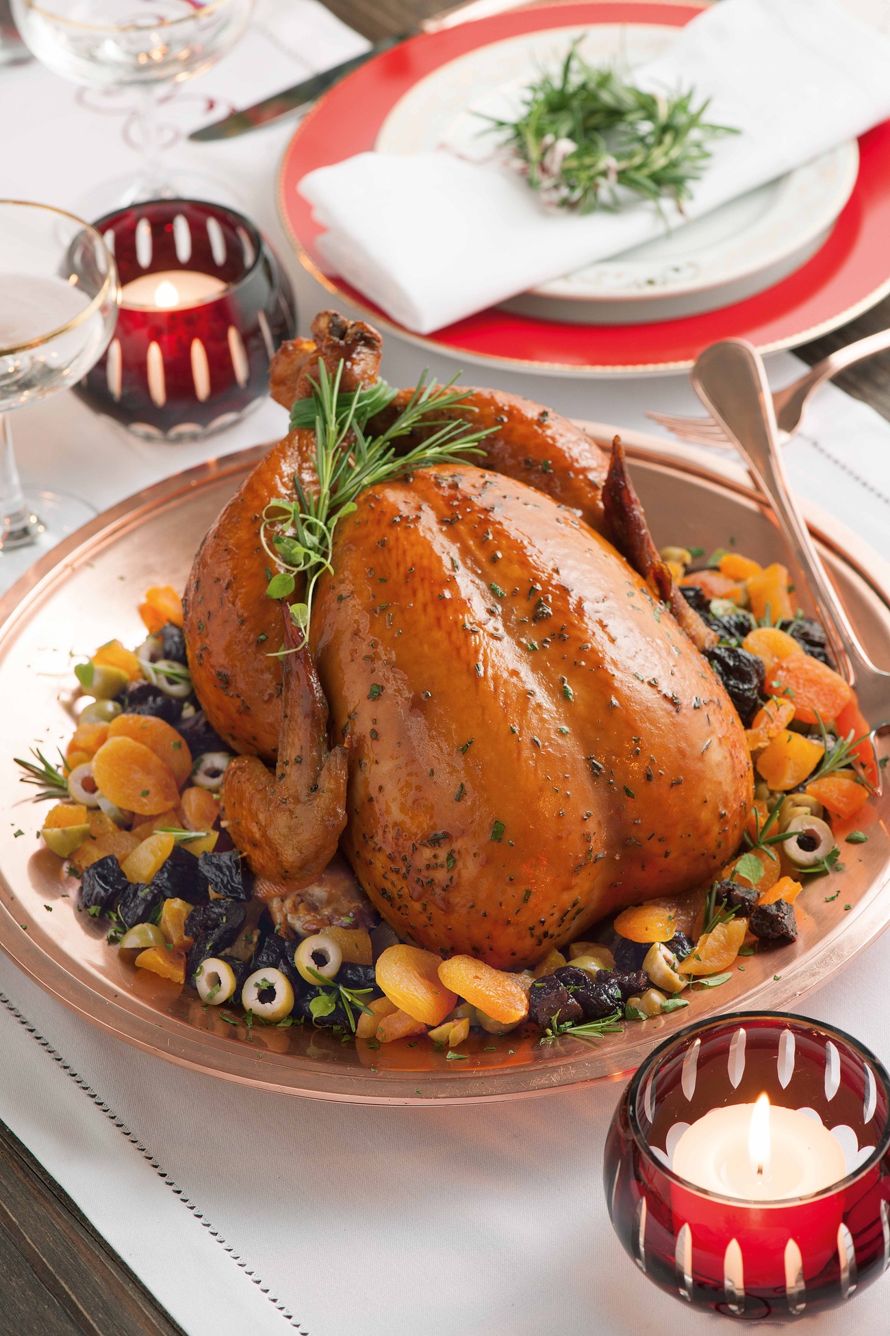 - Em outro recipiente, misture a cebola roxa, damascos secos, ameixas secas e azeitonas verdes. Recheie o frango com essa mistura, adicionando um toque especial ao prato.