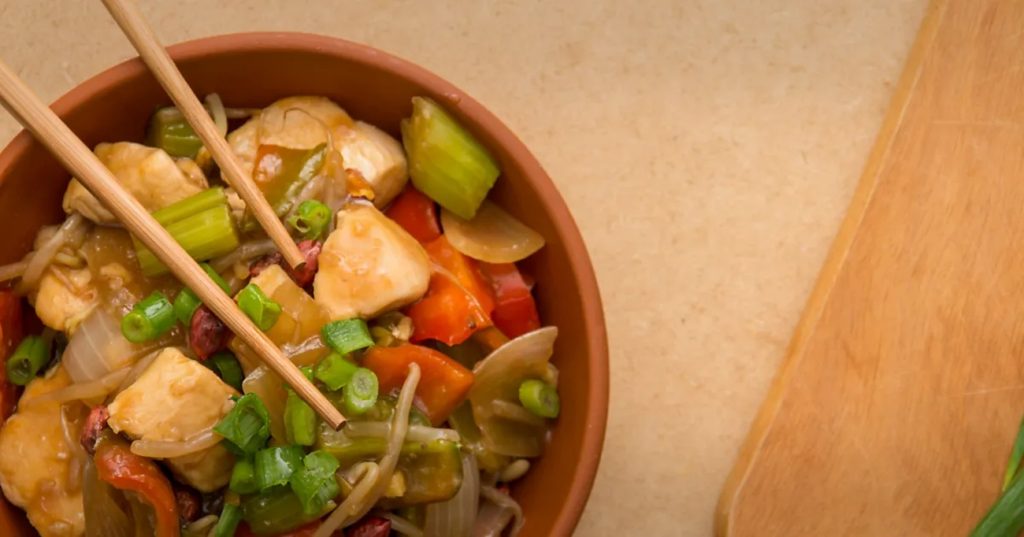 - Em uma panela grande ou wok, aqueça o óleo vegetal em fogo médio e doure o frango até que esteja bem dourado. Acrescente a cebola, o salsão, os pimentões (verde e vermelho), o gengibre e os brotos de feijão. Deixe refogar por alguns minutos, mexendo ocasionalmente, até que os vegetais estejam macios.