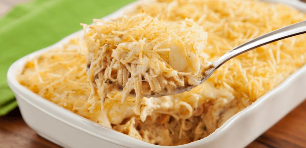 - Em um refratário médio, com dimensões de 30 x 20 cm, espalhe metade do requeijão. Coloque o creme de frango reservado sobre o requeijão e, por cima, adicione o restante do requeijão. Leve ao forno muito quente, preaquecido a 230 graus, por 20 minutos, ou até o requeijão começar a borbulhar e dourar. Retire do forno, salpique a batata-palha sobre o fricassê e sirva em seguida.