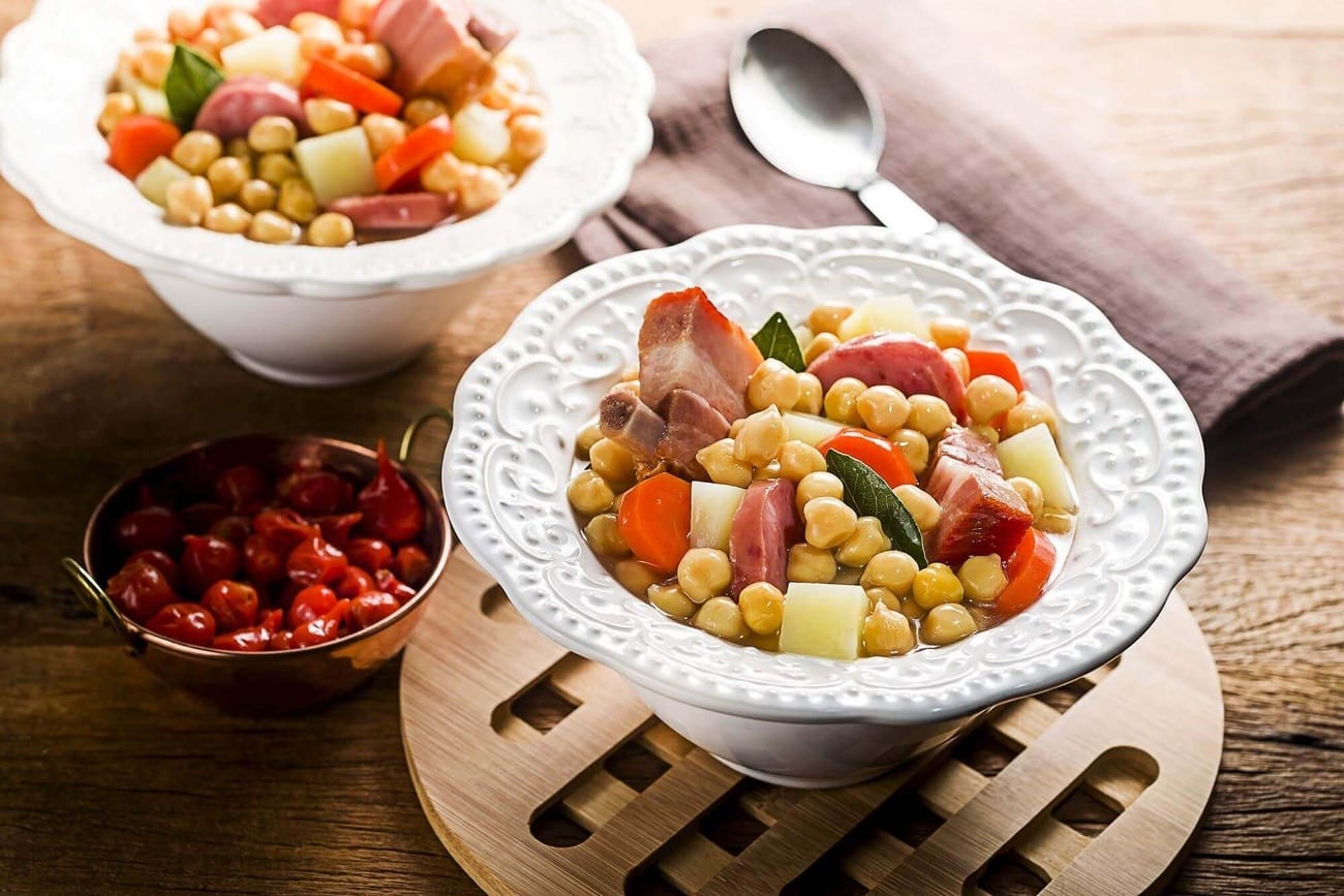 Quando penso em cozinha, sempre me lembro de momentos especiais à mesa com a minha família. A cozinha é o coração da casa, onde as pessoas se reúnem e compartilham momentos inesquecíveis. E, para mim, não há nada melhor do que preparar um prato delicioso para compartilhar com os entes queridos. Hoje, quero compartilhar com vocês uma das minhas receitas favoritas: o Grão de Bico à Portuguesa. Este prato é um verdadeiro tesouro da culinária portuguesa e é feito com ingredientes frescos e saborosos. A combinação do grão de bico com a linguiça calabresa, o paio e as costeletas defumadas é simplesmente divina. E, para tornar o prato ainda mais especial, acrescentei algumas batatas e cenouras para dar um toque de cor e textura. É um prato que certamente vai se tornar um favorito na sua casa!
