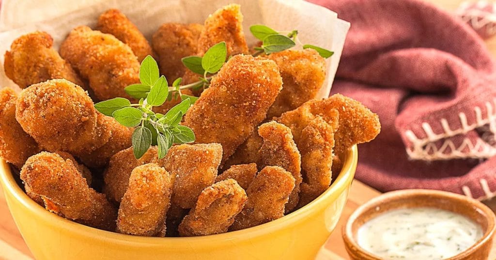 - Reparta a farinha de rosca e a de trigo em recipientes separados. Passe cada pedaço de lombo primeiro na farinha de trigo, depois nos ovos e, por último, na farinha de rosca. Essa camada tripla garante que as iscas fiquem bem empanadas e crocantes.