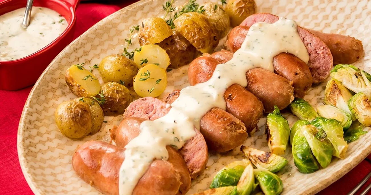 - Sirva as linguiças grelhadas com o creme de queijo. Se desejar, adicione também os acompanhamentos sugeridos, como batatas assadas e couve de Bruxelas salteadas.