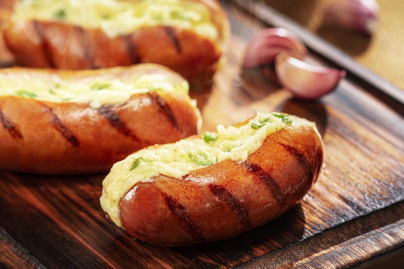 - Tire as linguias da grelha, corte ao meio, no sentido longitudinal, sem separar completamente, e recheie com o pur de alho.