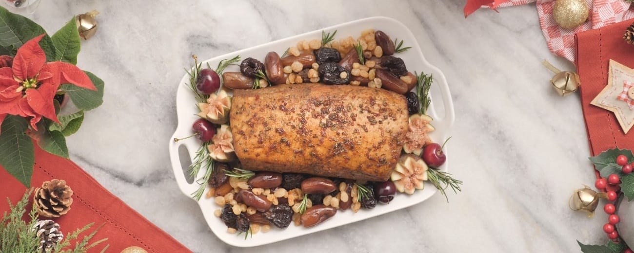 - Adicione as ameixas e tâmaras cozidas ao redor do lombo.