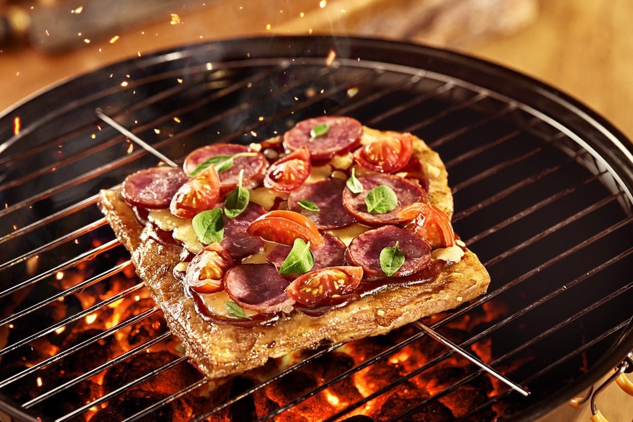 - Após tirar da churrasqueira, é hora de finalizar o prato: monte o matambrito como uma pizza. Cubra com molho de tomate, polvilhe o queijo mussarela ralado grosso e decore com calabresa e tomates cereja cortados ao meio.